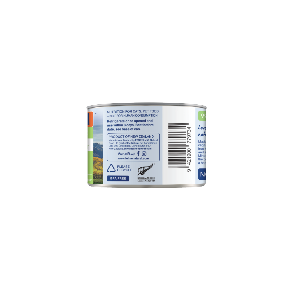 Our canned cat food is free from all gelling agents, fillers, grains and preservatives. All Feline Natural cans are BPA-free and endlessly recyclable.